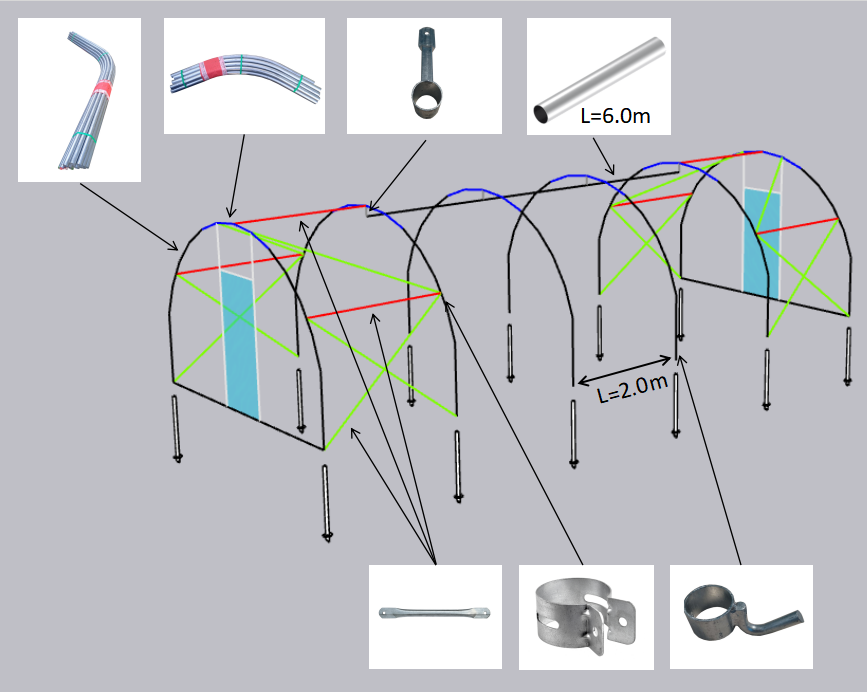 Arkveida vieglas konstrukcijas tunelis, skrūvējami enkurveida pamatu stieņi (33.7x1,5mm), arkas (33.7x1,5mm), vēja stieņi un papildus stiprinājumi (33.7x1,5mm un 33,7x1,0mm), visa konstrukcija ir cinkota - ZN 275, platums 4m, durvis 1,0mx1,8m, augstums korē 2,2m, cenā ietilpst Plastika Kritis UV5 plēve vienā kārtā, plēves stiprināšanas metode - aukla. Sānu vēdināšana, paceļot sānu malas uz augšu. Cenā nav iekļautas montāžas izmaksas, ja ir nepieciešama montāža, lūdzu sazināties ar mums.